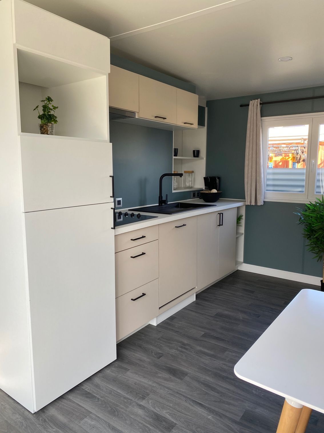 Salon central une banquette convertible , ce mobil home neuf de la marque Baticoncept de 29 m2 est optimisé à la fois par ses espaces de vie et de nuit. 2 chambres , salle de douche et wc séparés. De larges ouvertures pour éclairer un peu plus vos séjours in out avec sa baie fixe et sa double porte d'entrée.